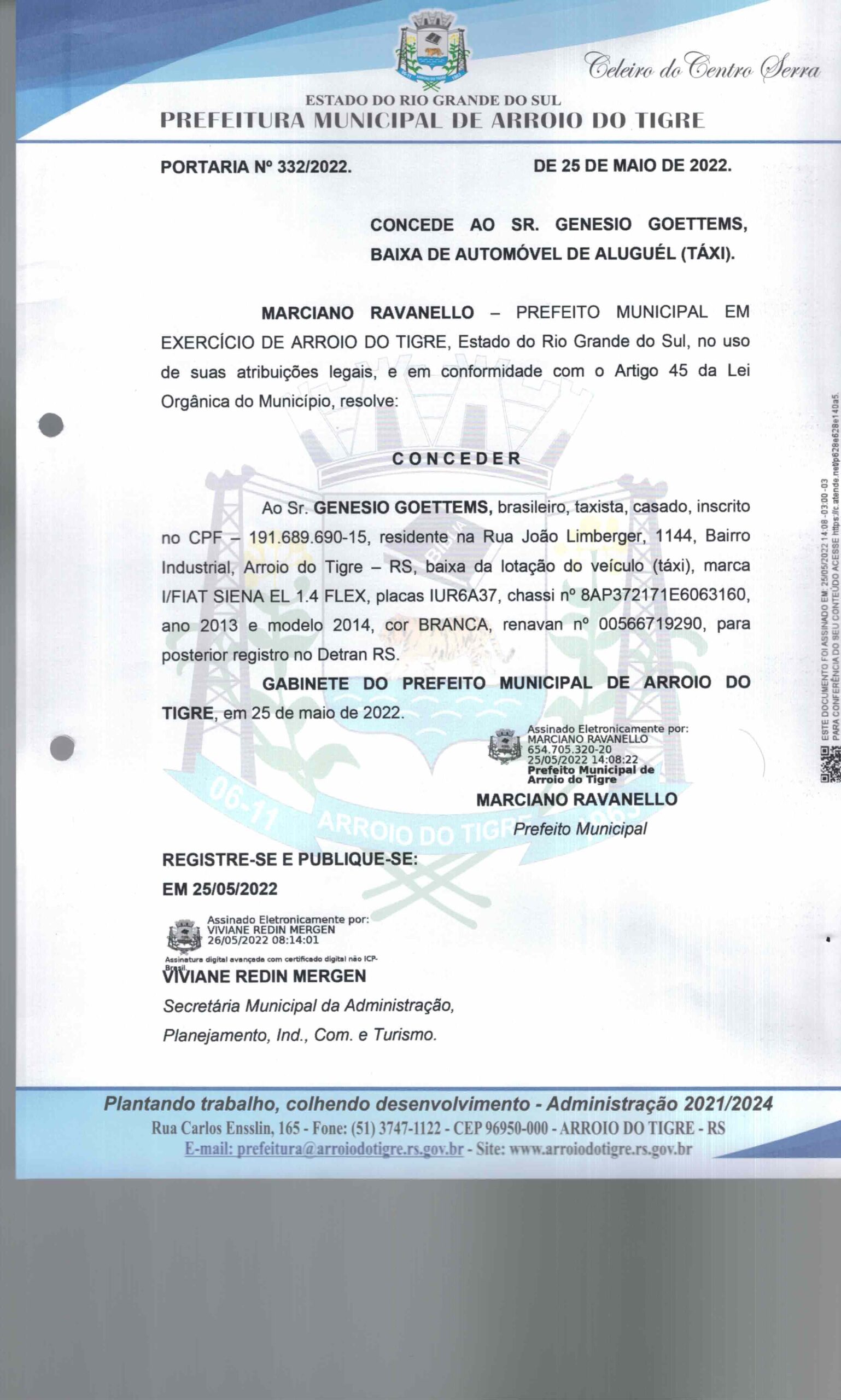 CONCEDE AO SR. GENESIO GOETTEMS, BAIXA DE AUTOMÓVEL DE ALUGÚEL (TÁXI).