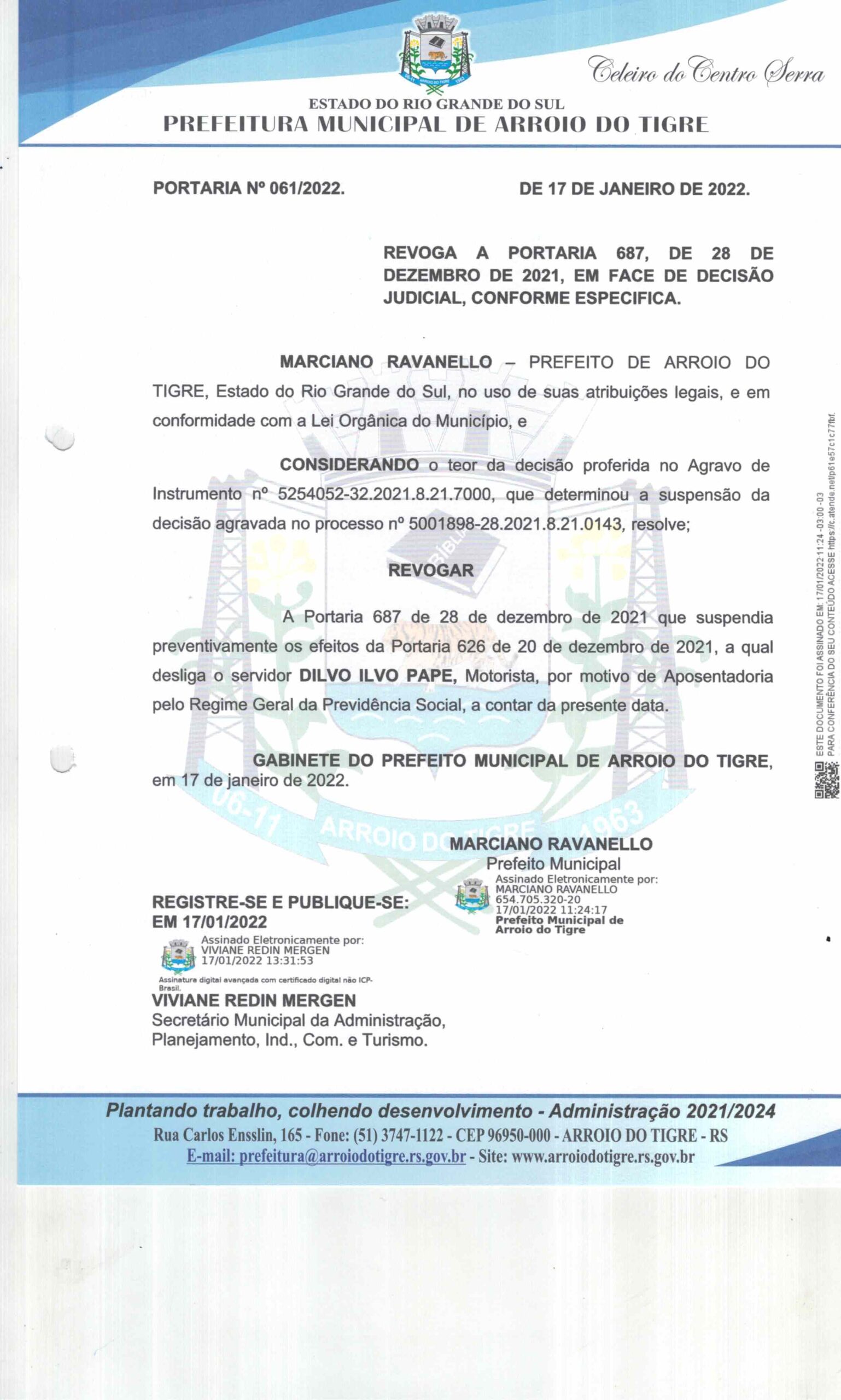 REVOGA A PORTARIA DE 687, DE 28 DE DEZEMBRO DE 2021, EM FACE DE DECISÃO JUDICIAL, CONFORME ESPECIFICA.