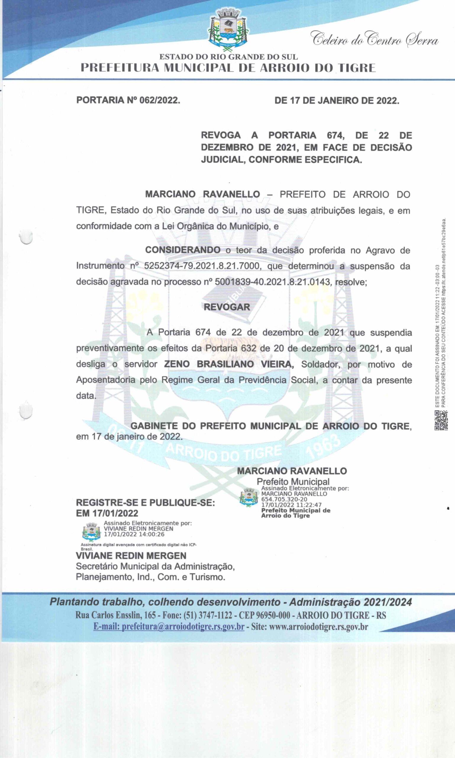 REVOGA A PORTARIA DE 674, DE 22 DE DEZEMBRO DE 2021, EM FACE DE DECISÃO JUDICIAL, CONFORME ESPECIFICA.