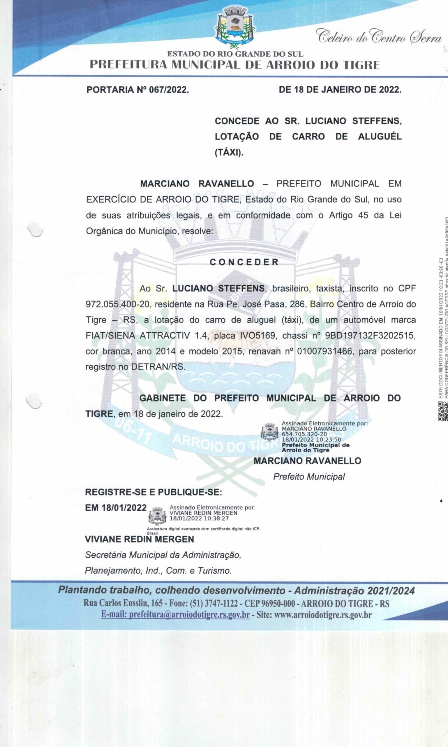 CONCEDE AO SR. LUCIANO STEFFENS, LOTAÇÃO DE CARRO DE ALUGUÉL (TÁXI).