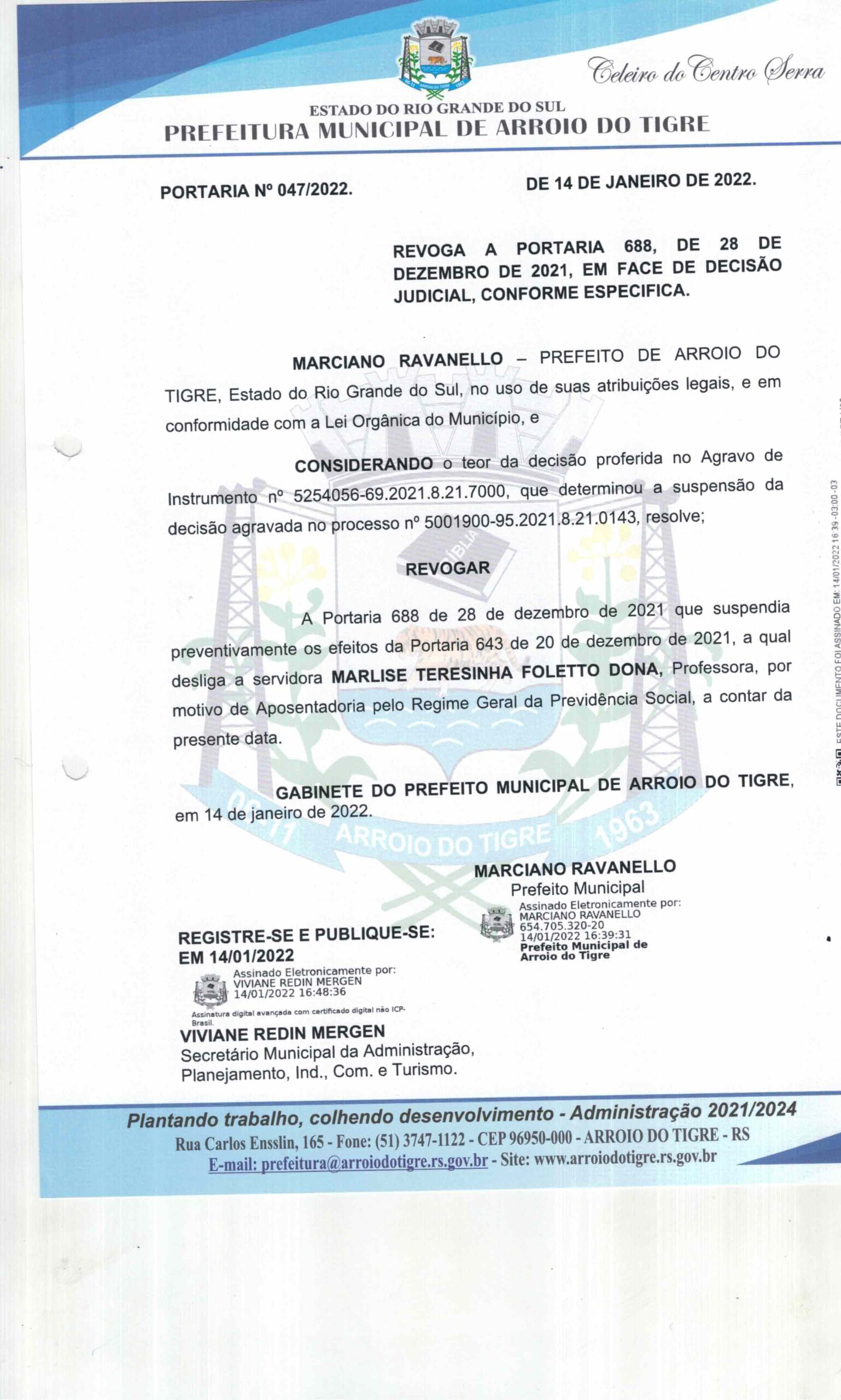 REVOGA A PORTARIA 688, DE 28 DE DEZEMBRO DE 2021, EM FACE DE DECISÃO JUDICIAL, CONFORME ESPECIFICA.