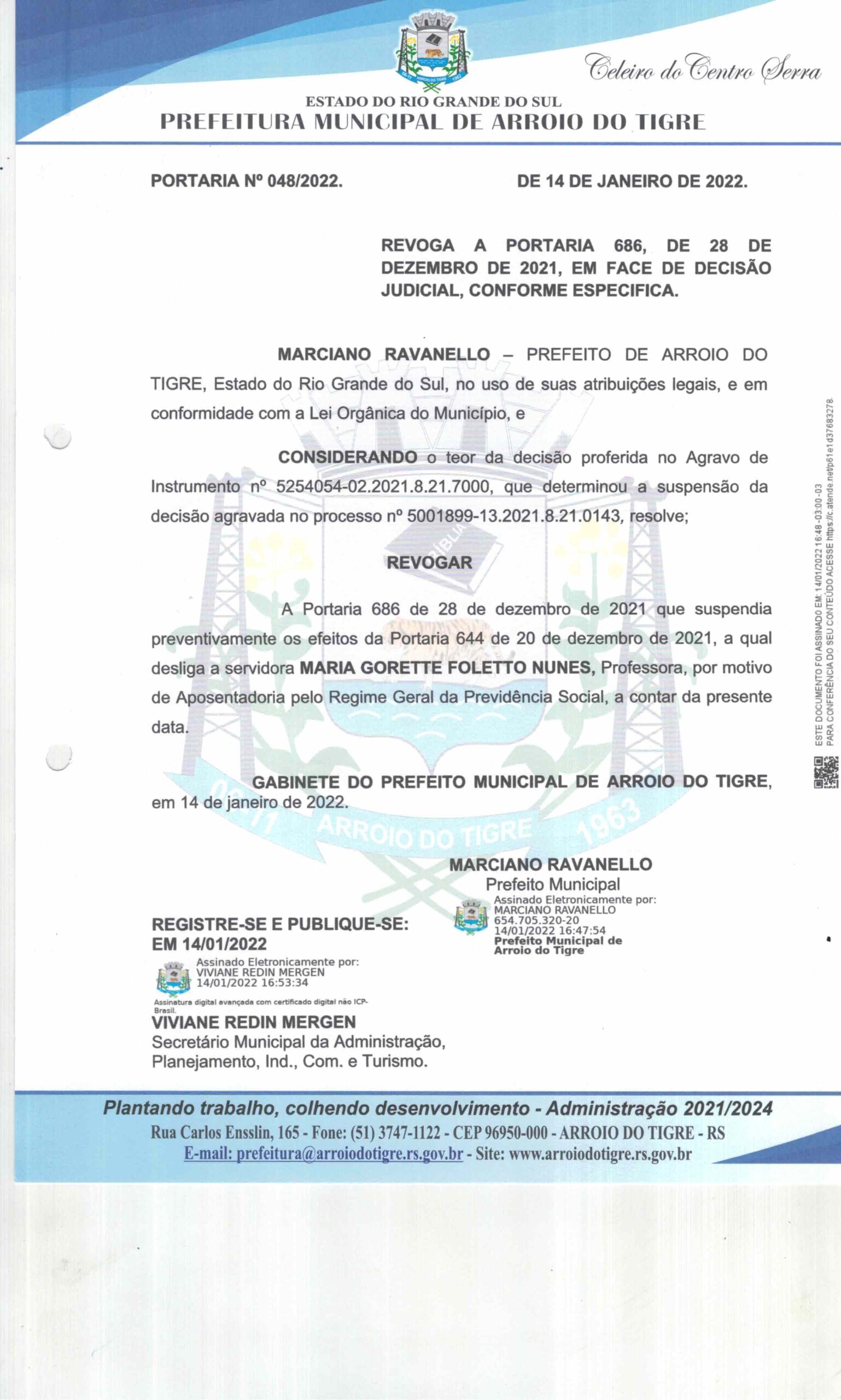 REVOGA A PORTARIA 686, DE 28 DE DEZEMBRO DE 2021, EM FACE DE DECISÃO JUDICIAL, CONFORME ESPECIFICA.